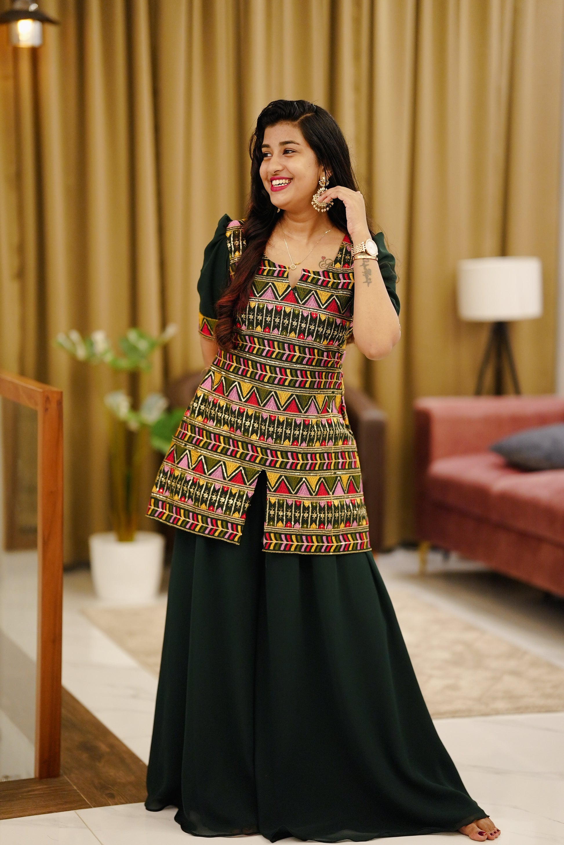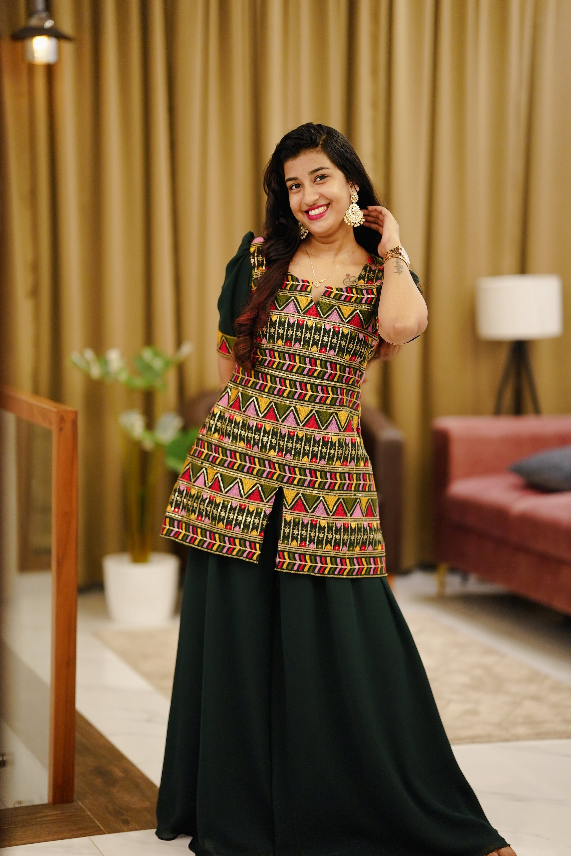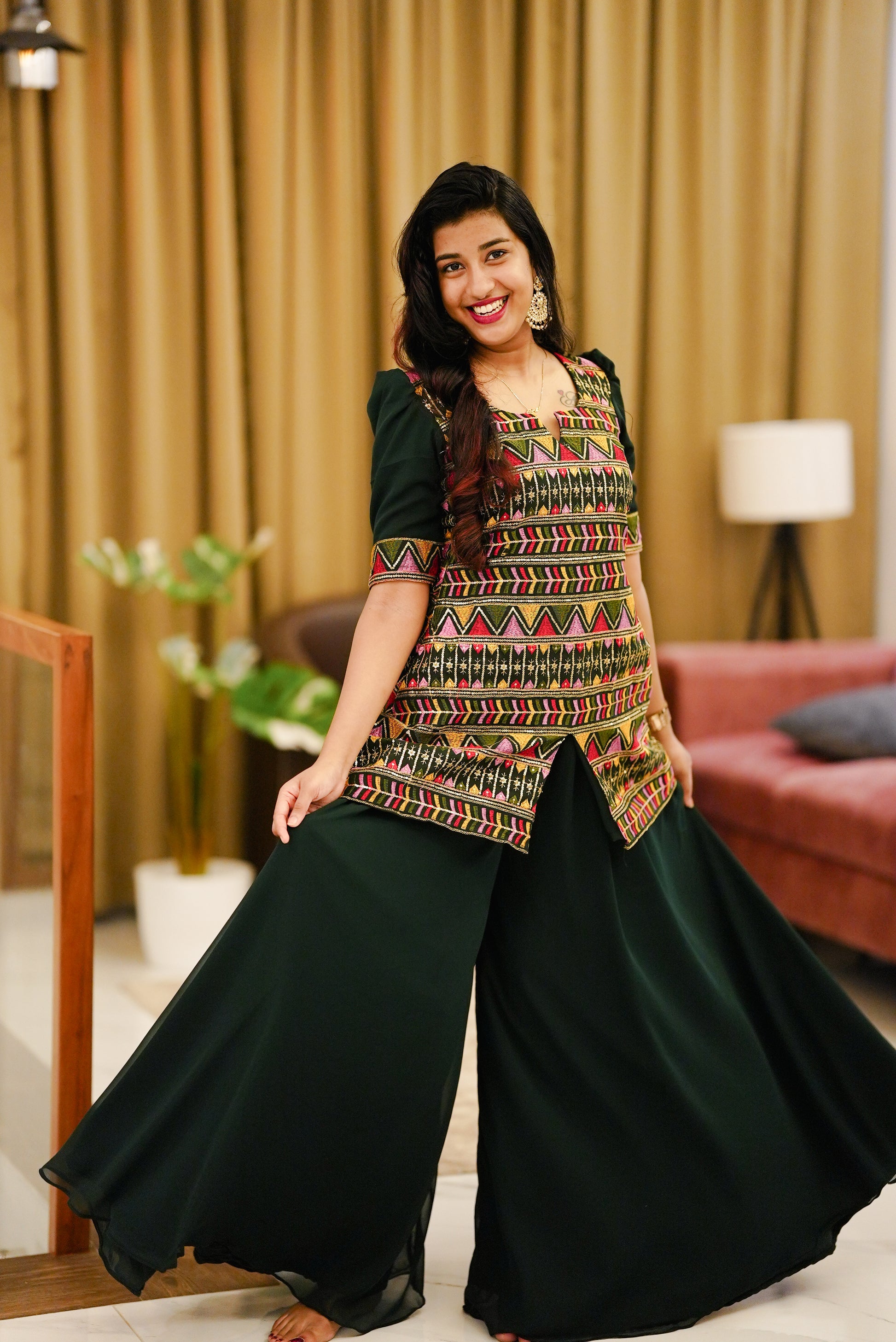 Dark green Heavy sequence and embroidery worked georgette top with dark green flared georgette palazzo.